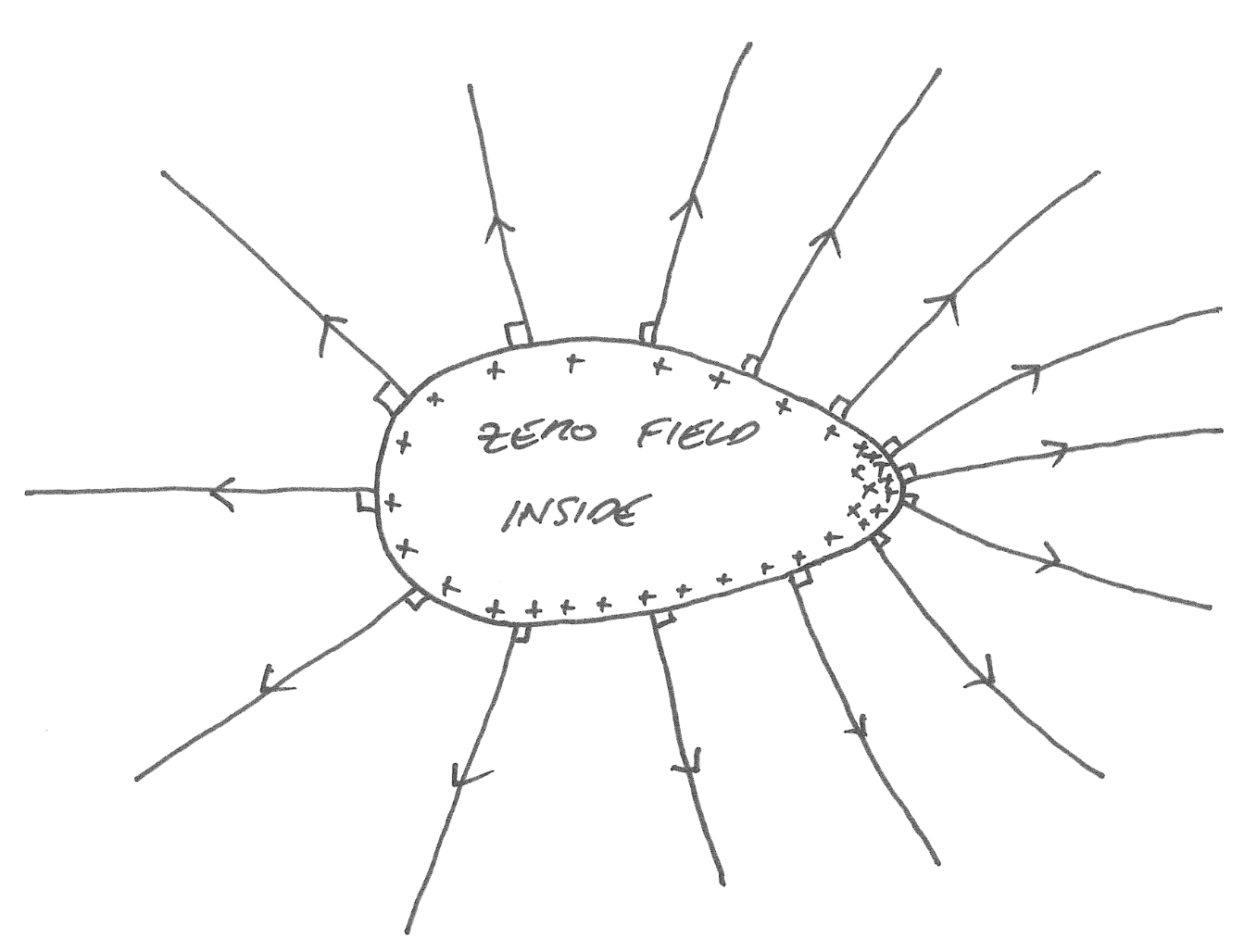 everywhere inside the conductor, since if it wasn’t internal electrons would be moving due to a force. - All charge resides on the surface of the conductor. This follows from ^P1 and Gauß’s law.